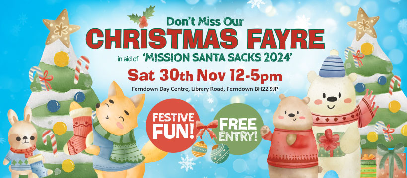 We are so excited to be returning with Ferndown Christmas Fayre! This year we’ve joined forces with the Rotary’s Christmas Lights Switch On for an even bigger Christmas extravaganza throughout the town centre. Get festive in aid of Ferndown Community Support’s ‘Mission Santa Sacks’, and Community Larder & Food Bank+! We’re opening up Ferndown Day Centre to bring you a day of all things Christmas. Join us for craft and games stalls, hot drinks, cider, homemade cake, and bacon butties, raffle, storytime, face painting, plus much more. We cant wait to see you!