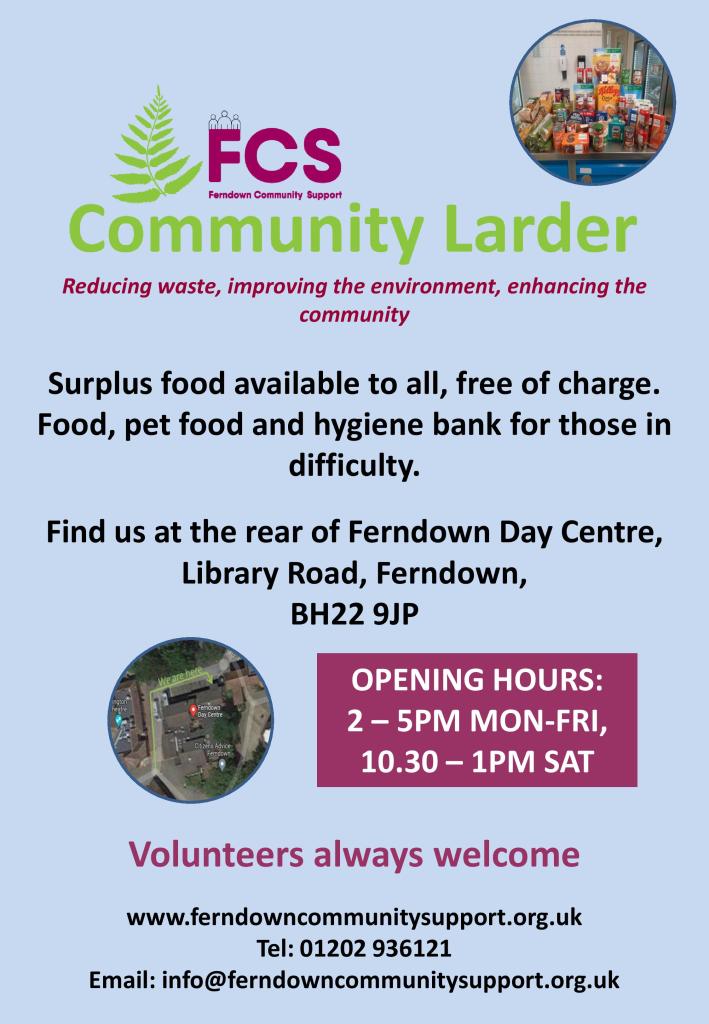 Our Community Larder is supported by local food stores and is open Monday – Friday from 2pm – 5.00pm, and Saturday between 10.30 -1pm. We also have a range of non food stuffs that we also distribute. The FCS Community Larder is based at the rear of Ferndown Day Centre, in Penny’s Walk/Library Road.