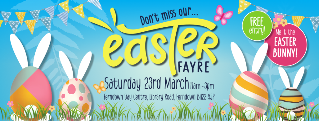 There’s going to be some happy hopping at our Ferndown Easter Fayre! All in aid of Ferndown Community Support’s Community Larder and Food Bank+. We are taking over the entire Ferndown Day Centre once again, and outside too, to bring you an afternoon of all things EASTER! Join us for local craft stalls, games stalls, hot drinks and snacks, homemade cakes, hotdogs, LIVE MUSIC, raffle, children’s craft room, face painting, plus much more! We cant wait to see you!