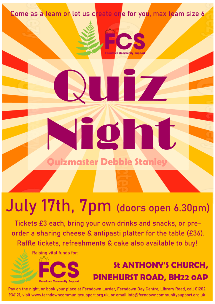 Buy tickets here, phone 01202 936121, or email info@ferndowncommunitysupport.org.uk. If you purchase tickets online, we will email you to confirm team arrangements, please check your spam in case it pops in there!