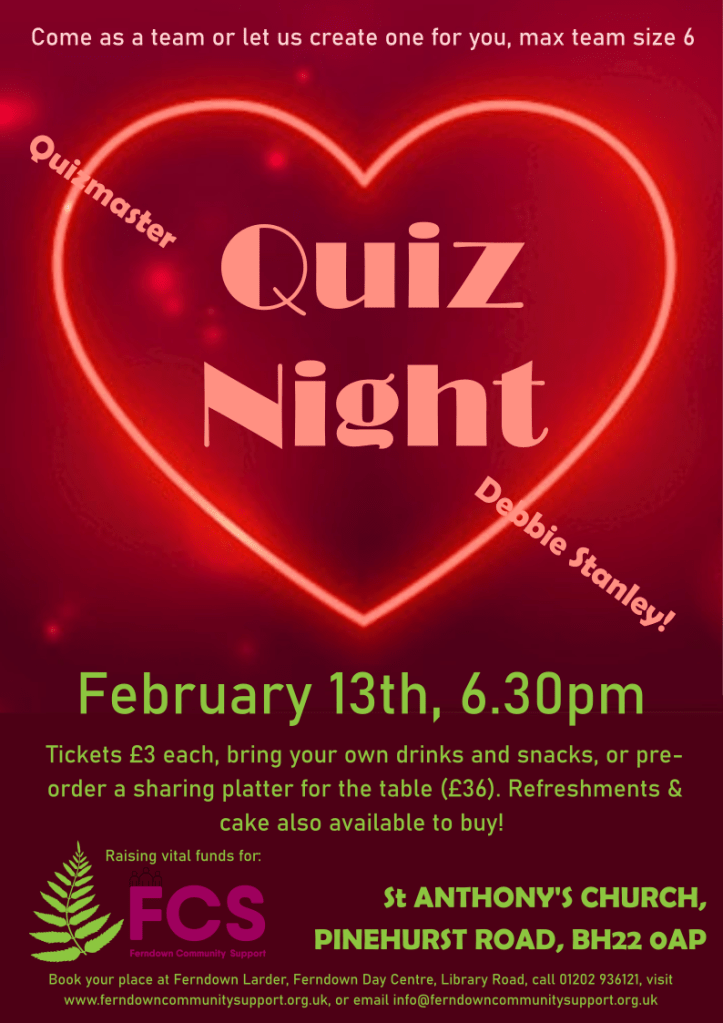 Buy tickets here, phone 01202 936121, or email info@ferndowncommunitysupport.org.uk. If you purchase tickets online, we will email you to confirm team arrangements, please check your spam in case it pops in there!